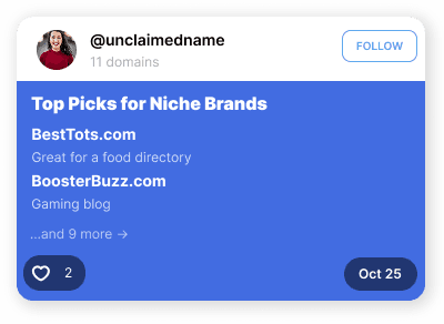 Approved curators can showcase their expertise by providing value for domain investors through curated domain lists of both registered (for sale) and unregistered domain names.